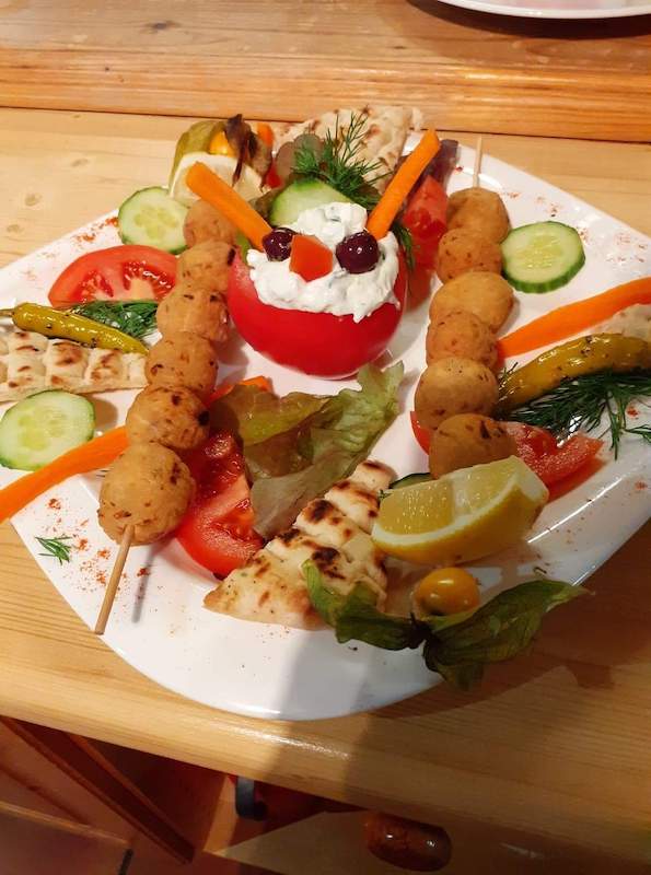 Gefüllte Weinblätter, weiße Bohnen, Auberginen, Saganaki, Zaziki, Scheibenkartoffeln oder Pommes